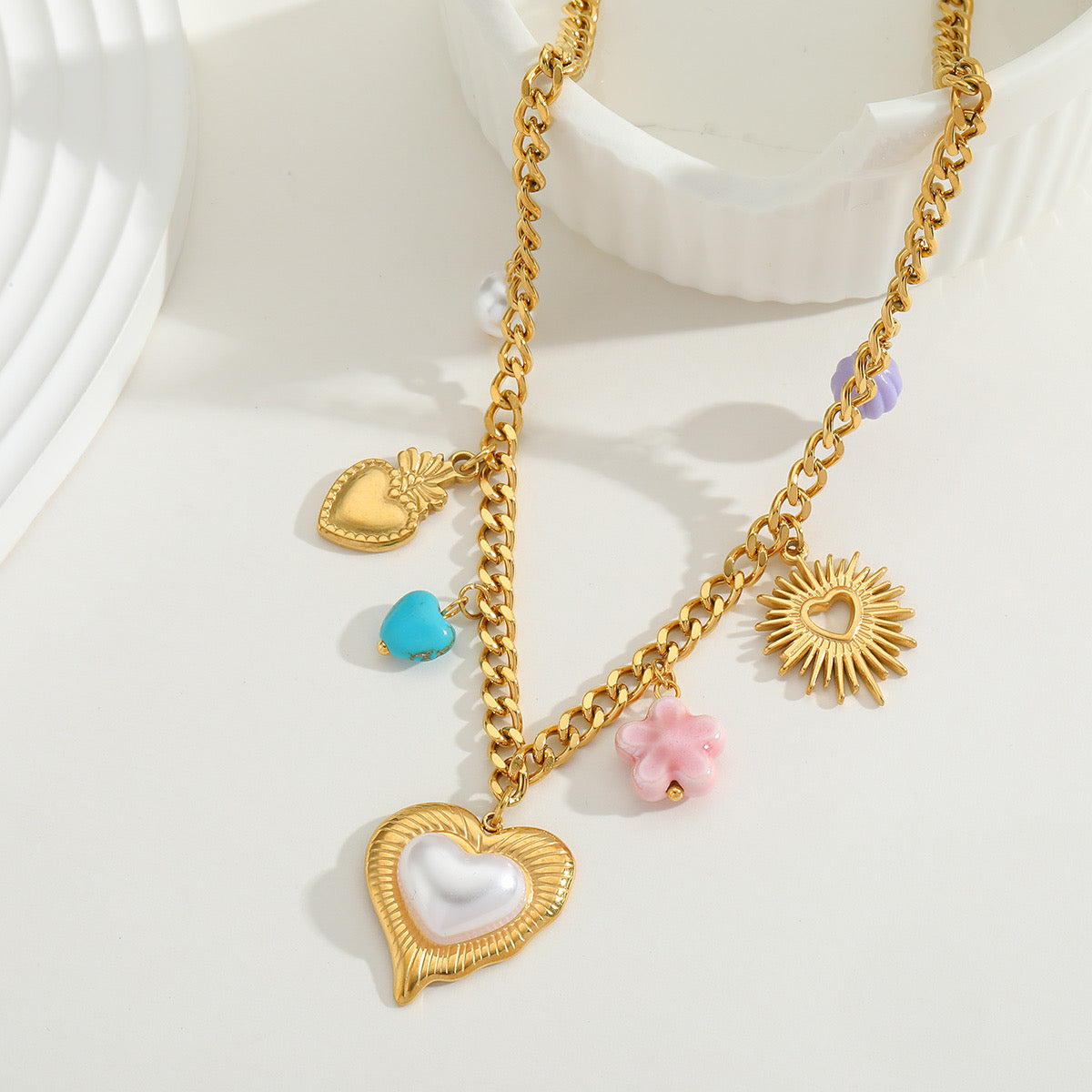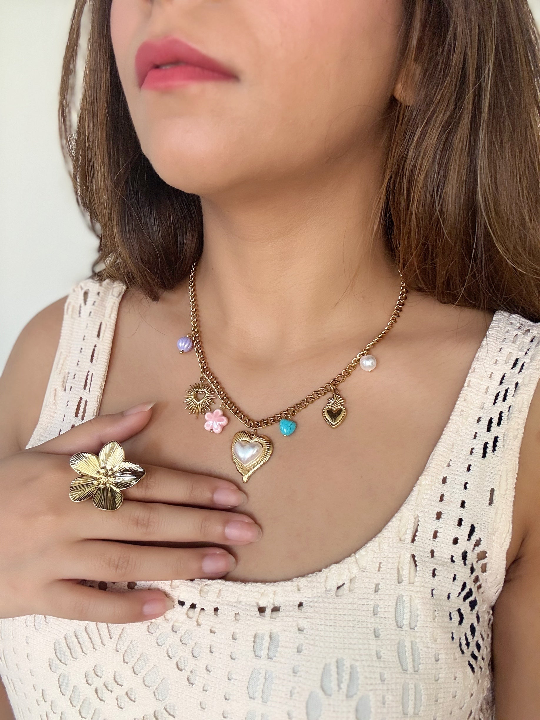 Beach holiday? Summer Getaway? We've got you covered! Our adorable charm necklace is anti tarnish and goes perfectly with your sundresses and beach wear. The mix of charms- hearts, flowers and pearls, give it a romantic and aesthetic touch.