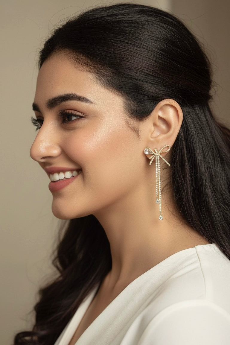 A delicate symphony of elegance and sparkle, these earrings feature hand-set stones that trace graceful bow motifs, cascading into twin strands ending in teardrop brilliance.