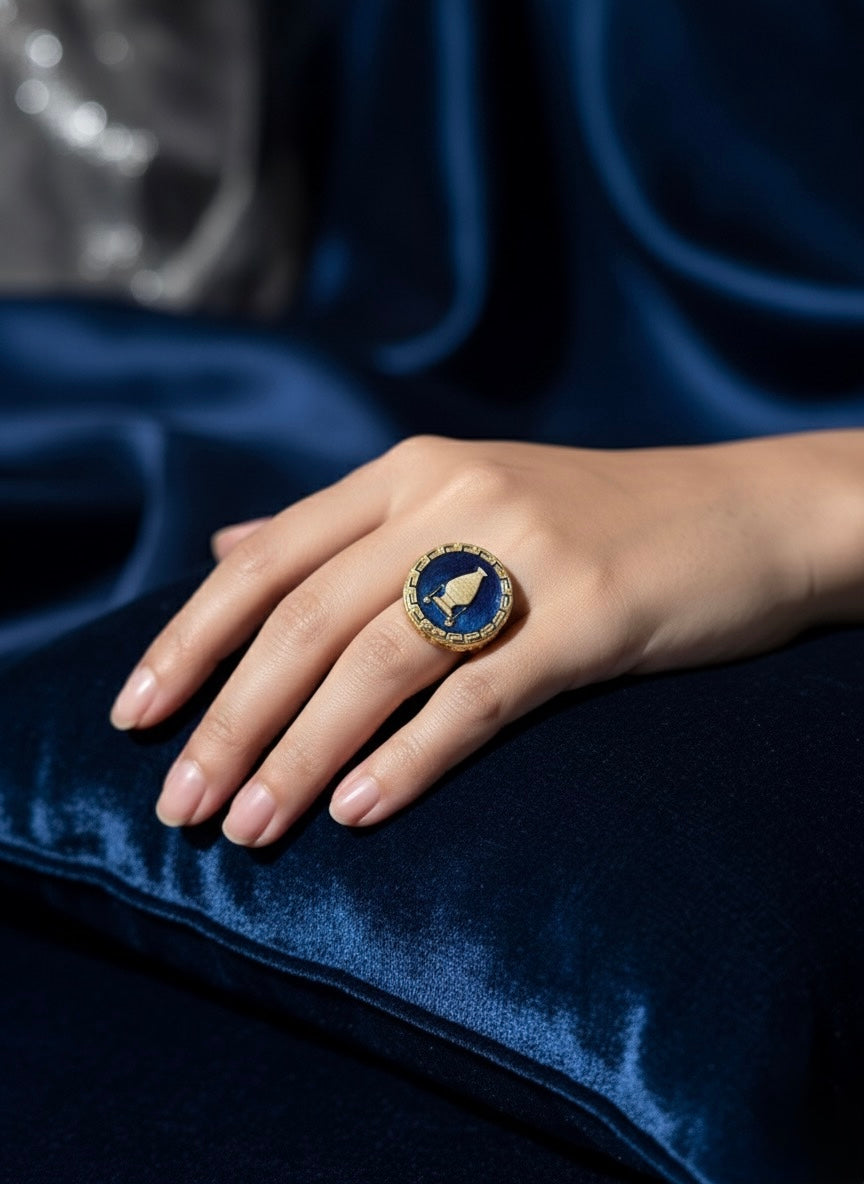 Expertly crafted in rich brass and adorned with glossy enamel, this adjustable ring showcases an intricate urn motif, evoking the charm of classical antiquity.