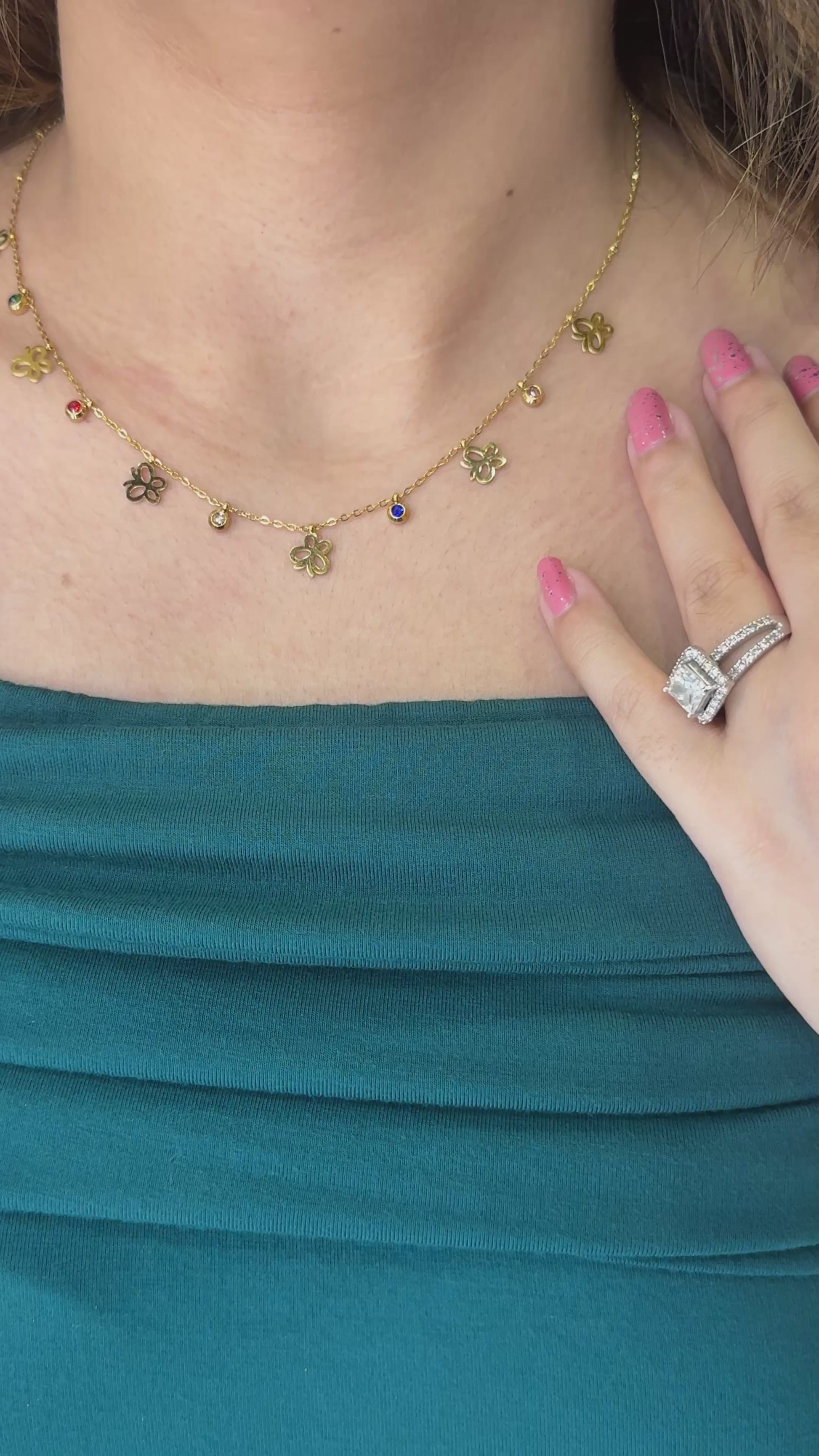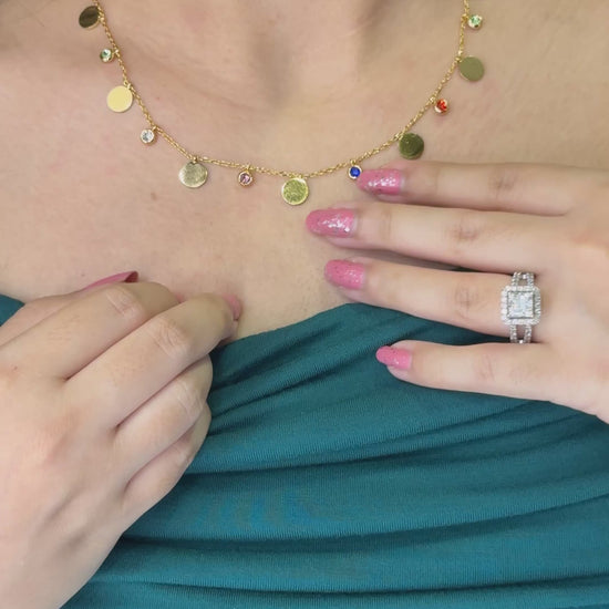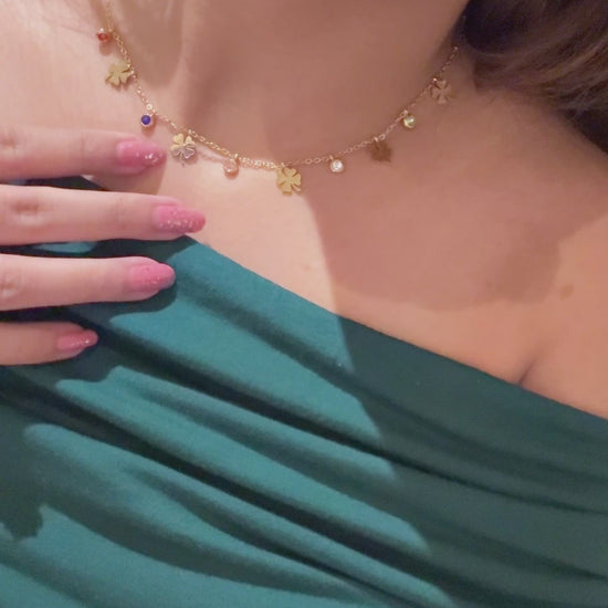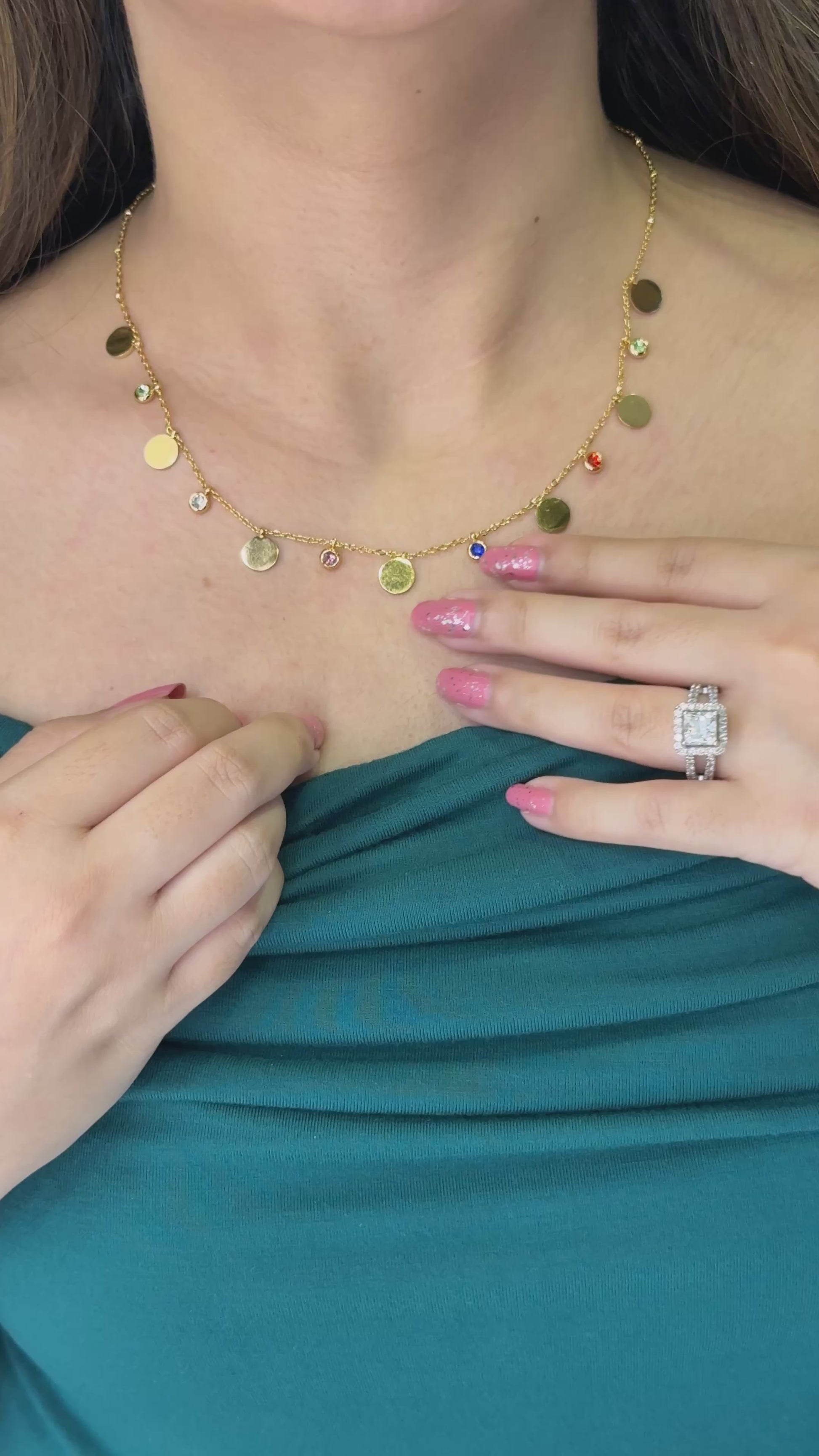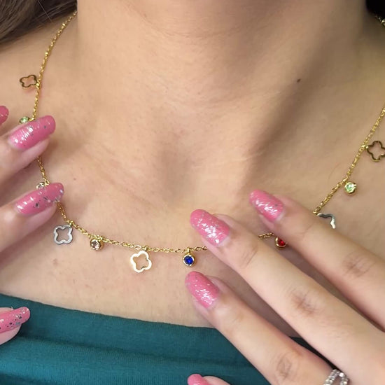 Our Charm Play Necklace brings together delicate discs and sparkling stones, finished with a choice of whimsical charms — from hearts that speak of love, to butterflies that embody transformation, to clovers that whisper good fortune.
