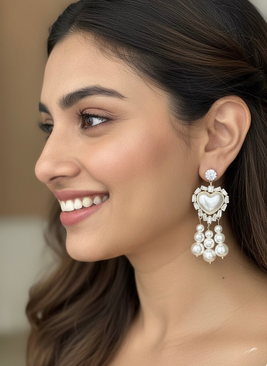 A royal affair of love and luxury-Crowned Heart features a luminous heart centerpiece framed with sparkling crystal baguettes, finished with cascading pearl drops that sway with grace. Plated in gold, these earrings are the perfect blend of regal glamour and soft romance.
