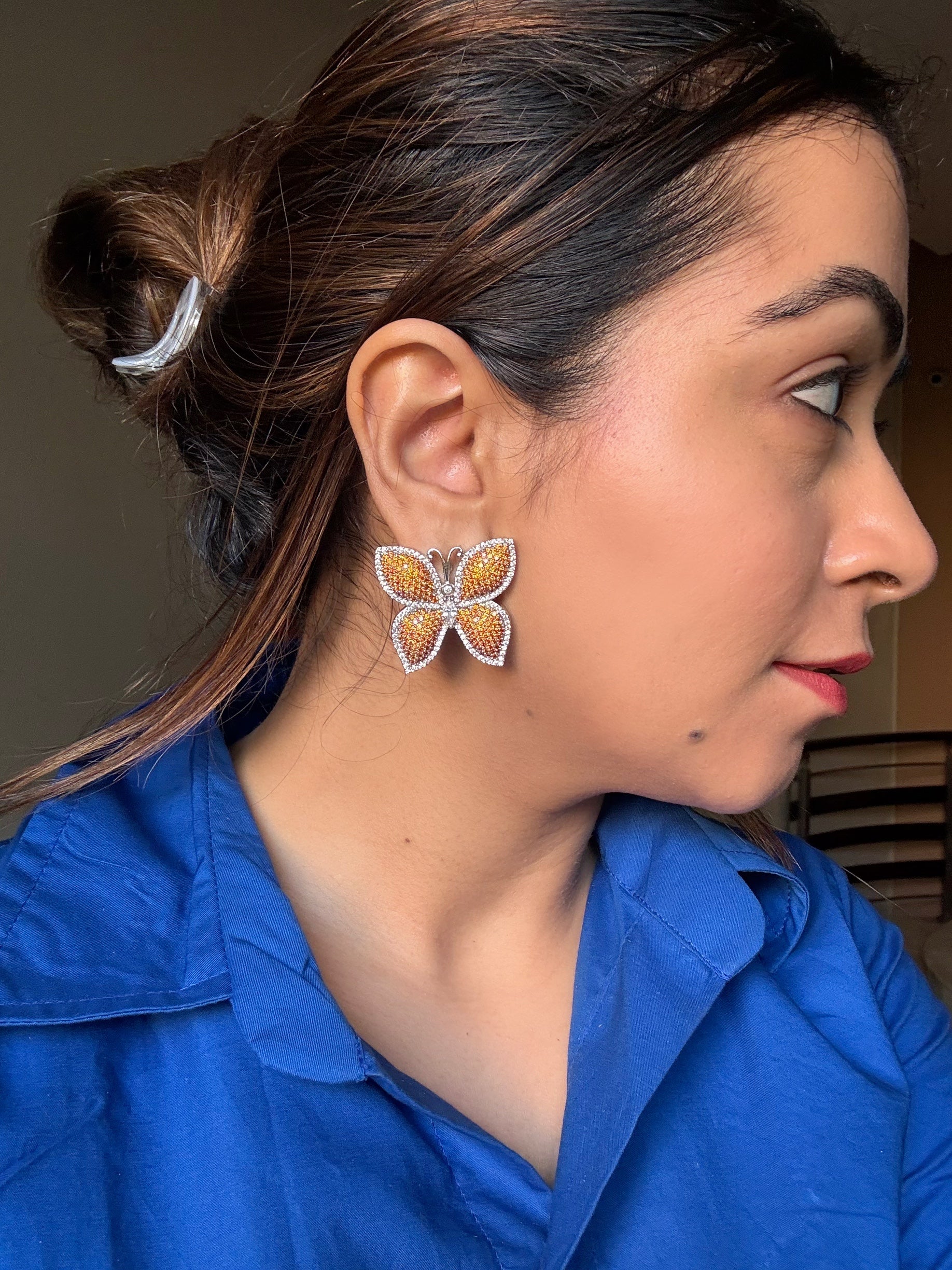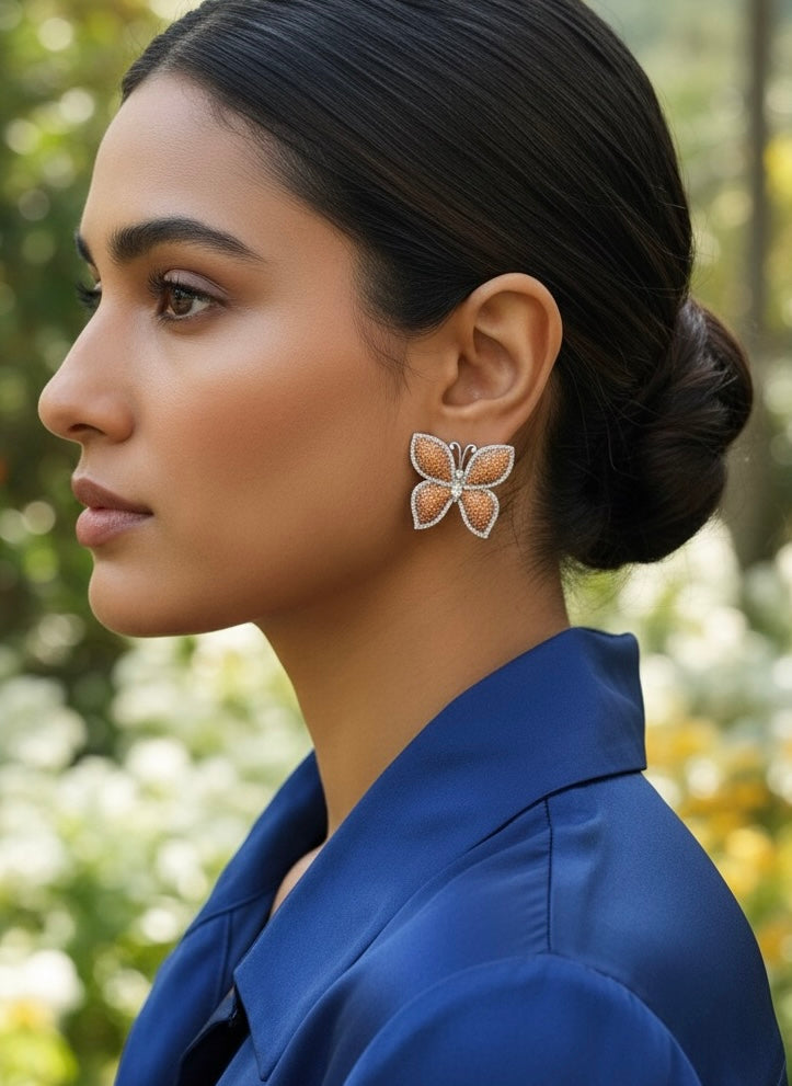 These earrings feature an intricate butterfly design encrusted with shimmering gemstones in lavender and orange. The wings are delicately outlined with sparkling stones, while a teardrop-shaped gem forms the body, adding a touch of elegance.