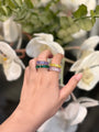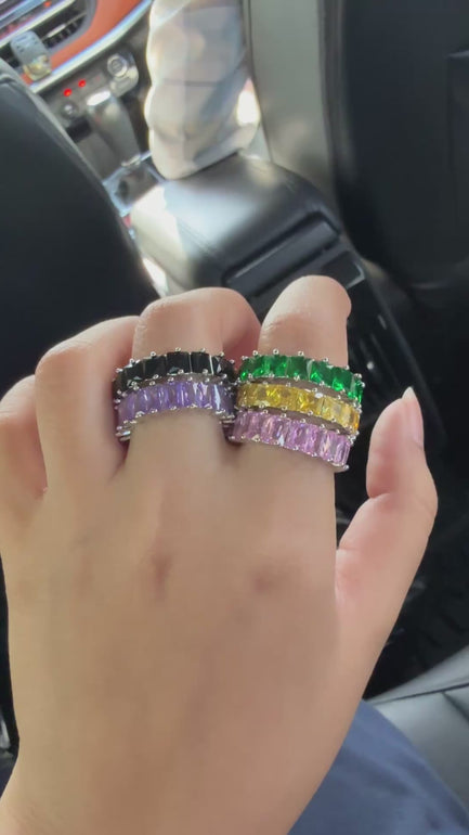 The Elysian Band is a statement piece that embodies pure elegance and vibrant luxury. Set with a seamless row of radiant, emerald-cut gemstones in rich hues—emerald green, lavender, golden yellow, black and blush pink—this ring exudes sophistication and charm.