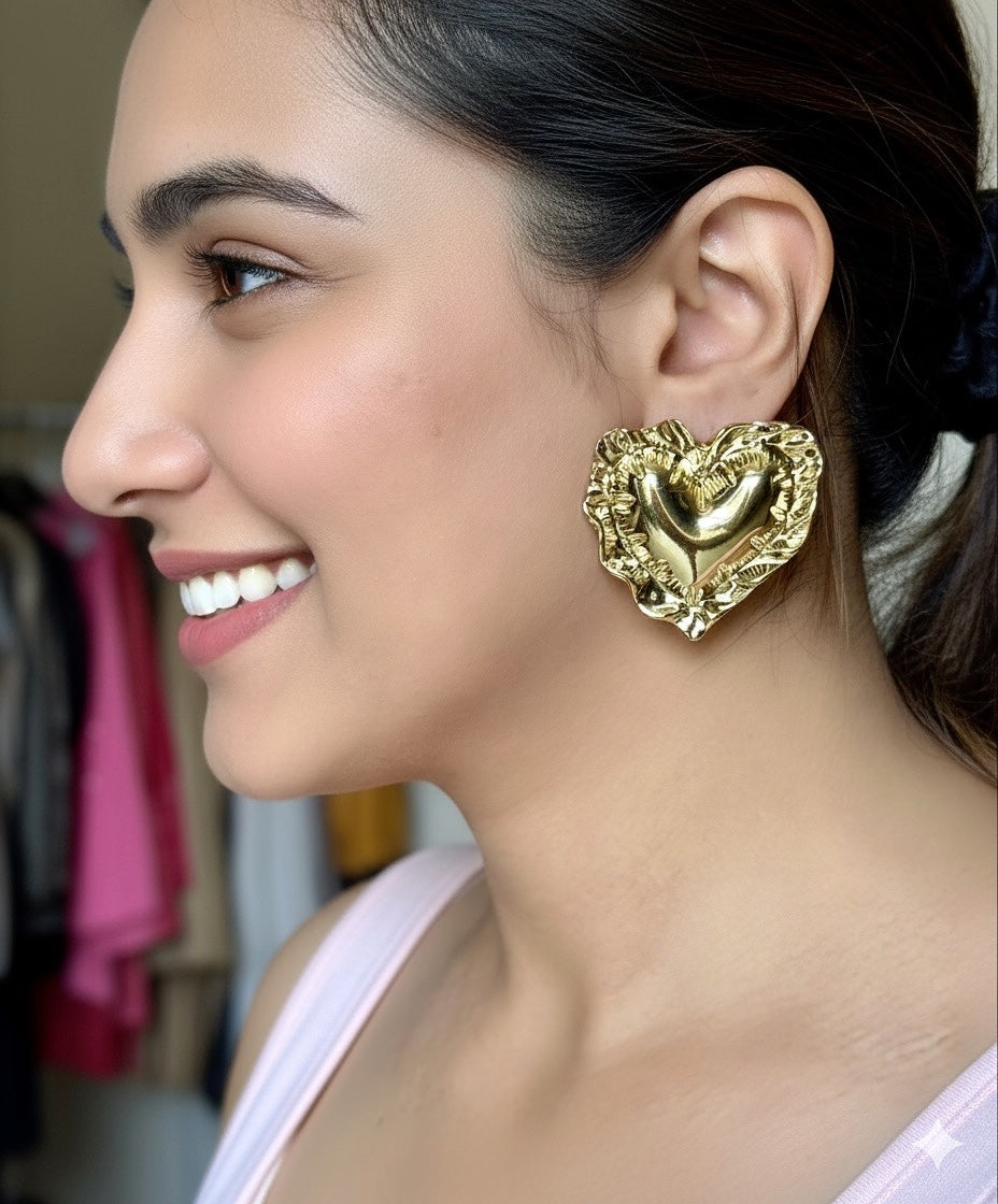 Fierce Romance is not for the faint-hearted—these oversized, heart-shaped earrings feature a rich molten-gold finish with textured, ruffled edges that echo bold femininity and unapologetic power.