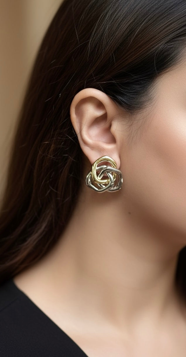 Where contrast meets harmony. These sculptural earrings feature a striking interplay of gold and silver tones, seamlessly woven into a bold, geometric knot.