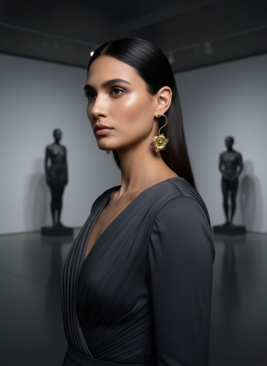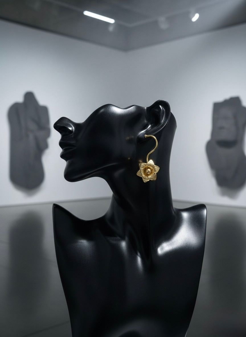 A radiant statement earring that blends sculptural elegance with floral charm.