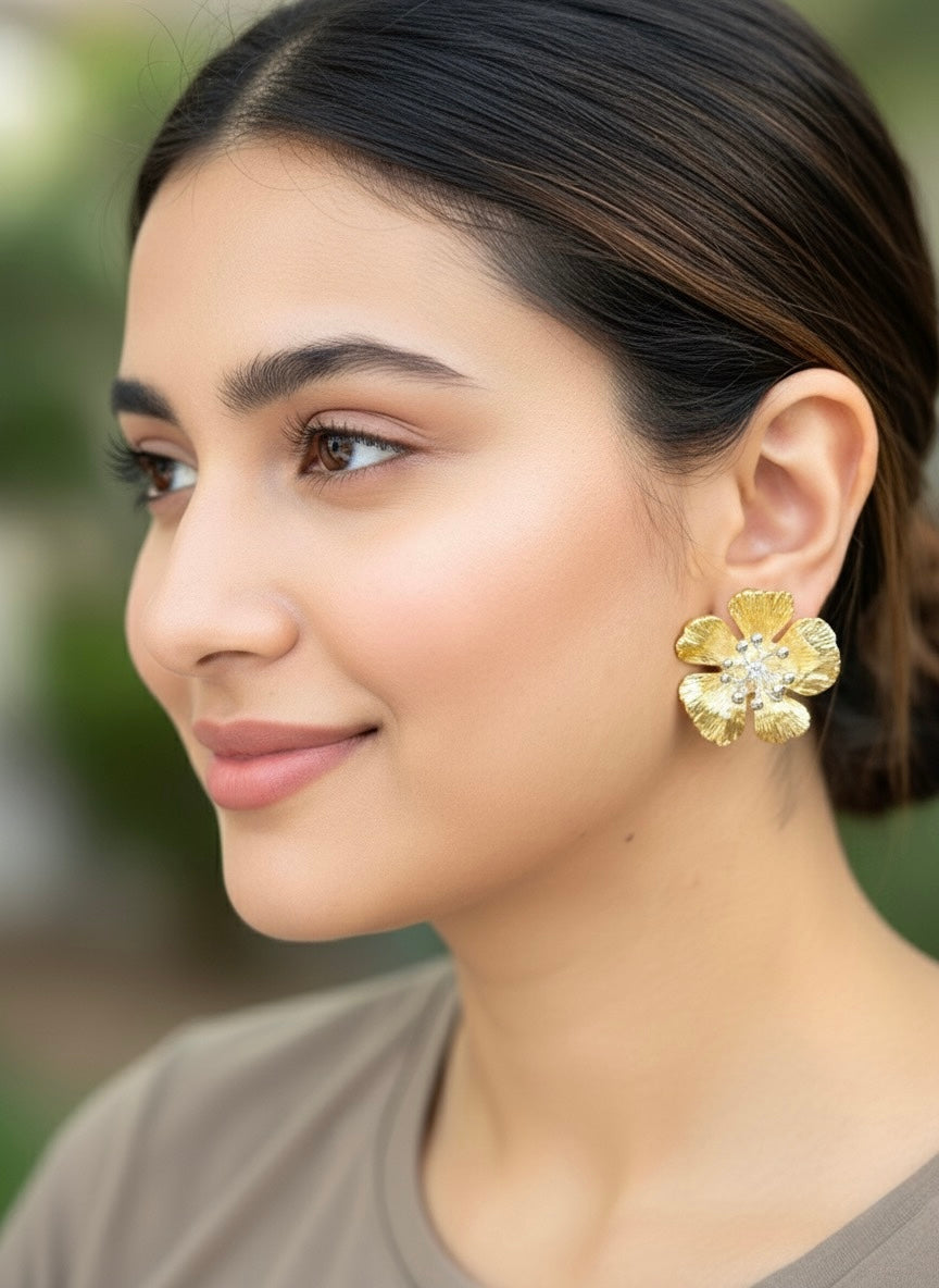 These elegant floral earrings, with their textured gold petals and delicate silver-toned accents in the center, exude a timeless charm. They are anti tarnish and light weight.