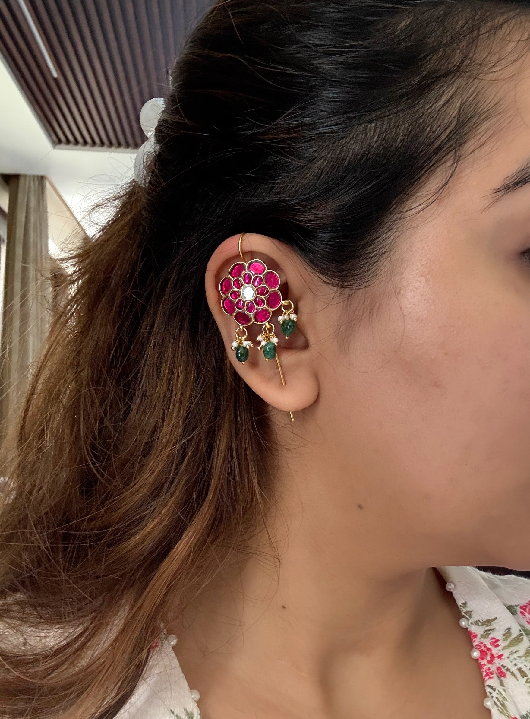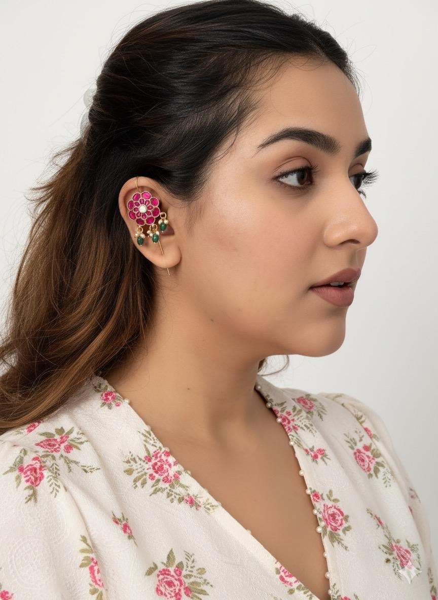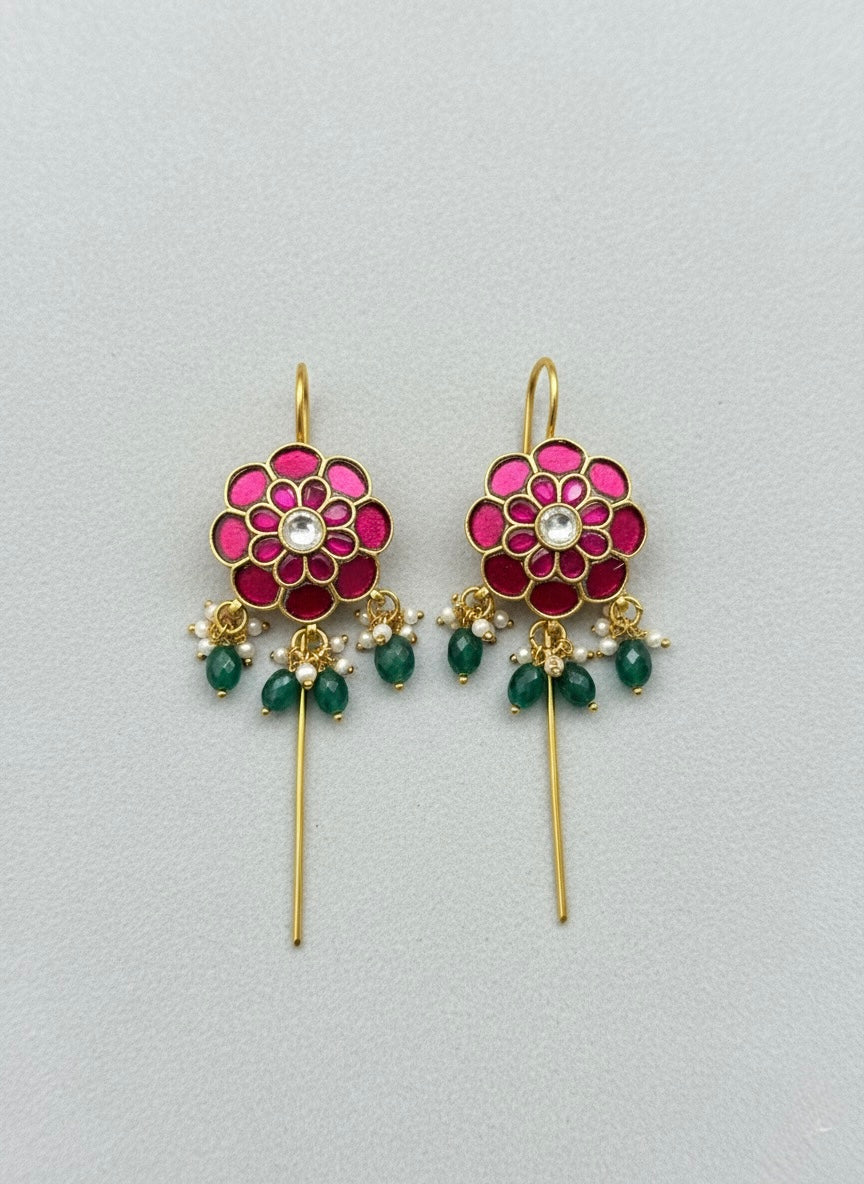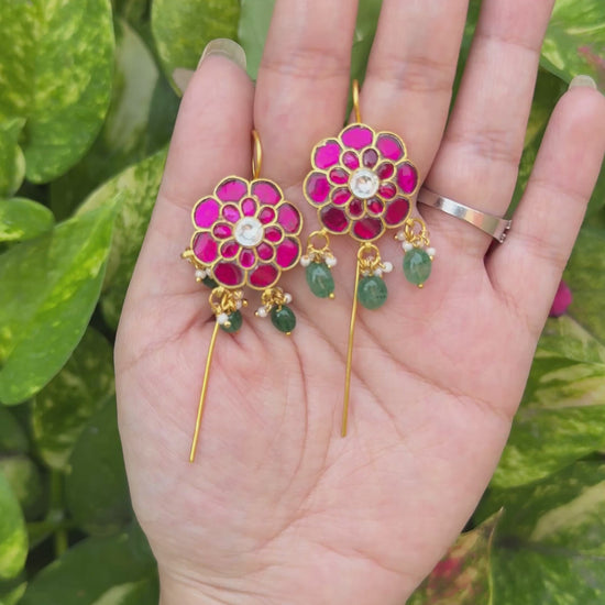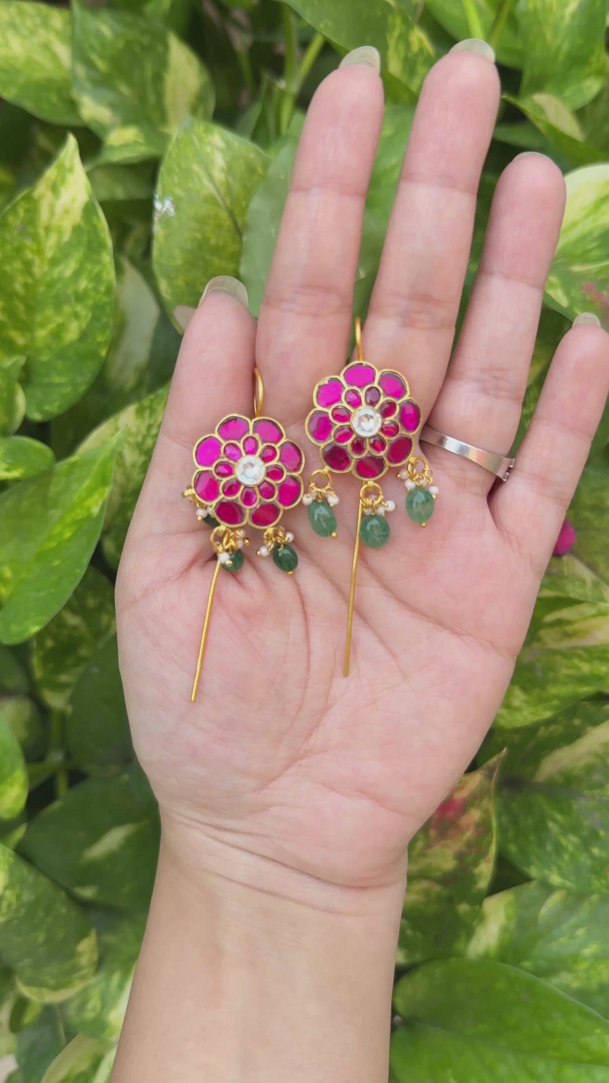 A delicate bugadi inspired by blooming gulmohar, featuring radiant pink enamel petals with a kundan centerpiece, accented with pearls and emerald drops for timeless elegance.