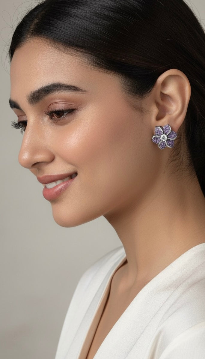 A true embodiment of luxury and femininity, Lavender Love is a radiant addition to any jewelry collection. These exquisite earrings feature delicate petals encrusted with shimmering lavender-hued stones, accentuated by dazzling clear stones at the center.