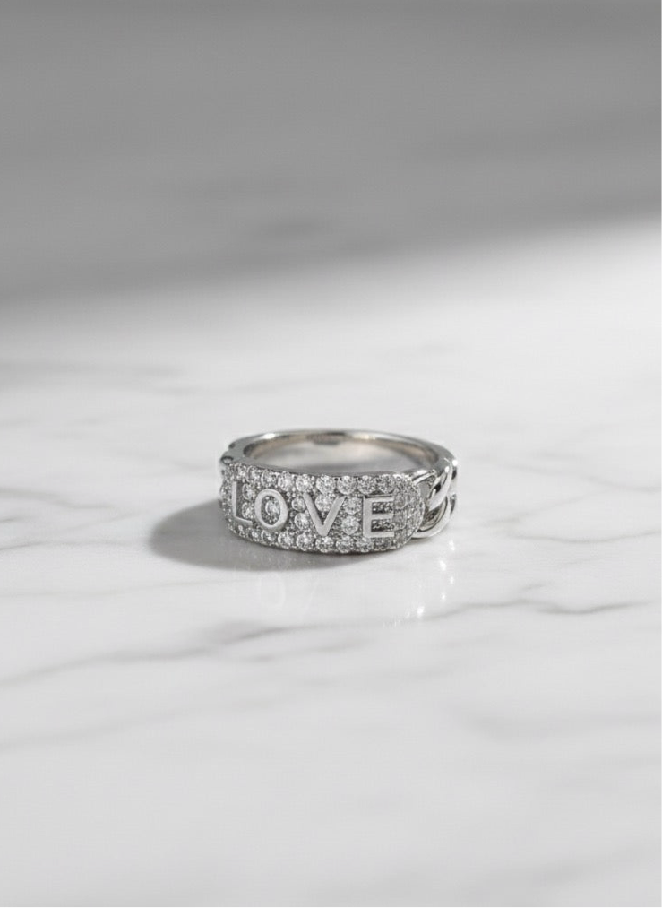Make a bold statement with our “Love Band” — a dazzling ring that spells out L-O-V-E in shimmering brilliance.