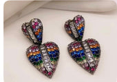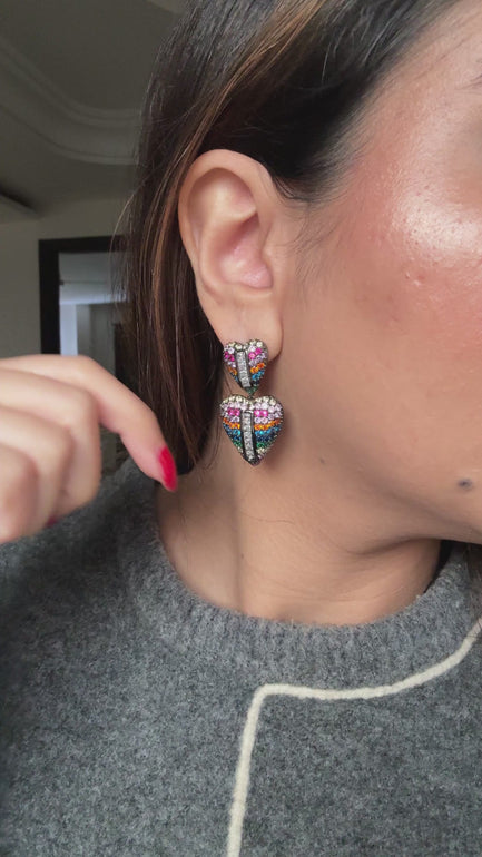 These heart-shaped beauties are adorned with a dazzling array of multicolored gemstones, creating a vibrant, rainbow-like sparkle. A sleek strip of baguette-cut stones adds a touch of elegance, balancing their playful and sophisticated appeal.