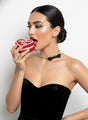 This is an elegant and edgy choker-style piece. It features a single row of clear, round-cut rhinestones set in a delicate, closely linked chain. The focal point of the design is a sleek, matte black bow accent placed asymmetrically to one side, adding a touch of modern charm and contrast to the sparkling stones.