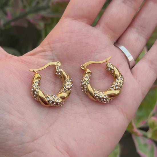 These striking mini hoops feature a sophisticated, continuous twist motif. One polished band in a rich gold tone is beautifully intertwined with a second band meticulously adorned with brilliant-cut, high-clarity crystal accents.