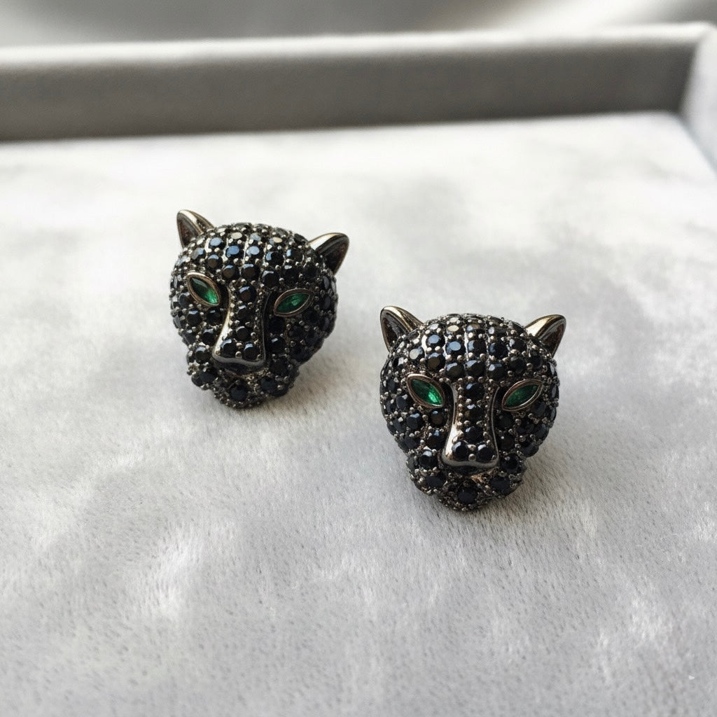These are elegant stud earrings shaped like panther heads. They are black in color, with intricate detailing. The eyes are strikingly green, adding a vibrant pop of color and intensity.