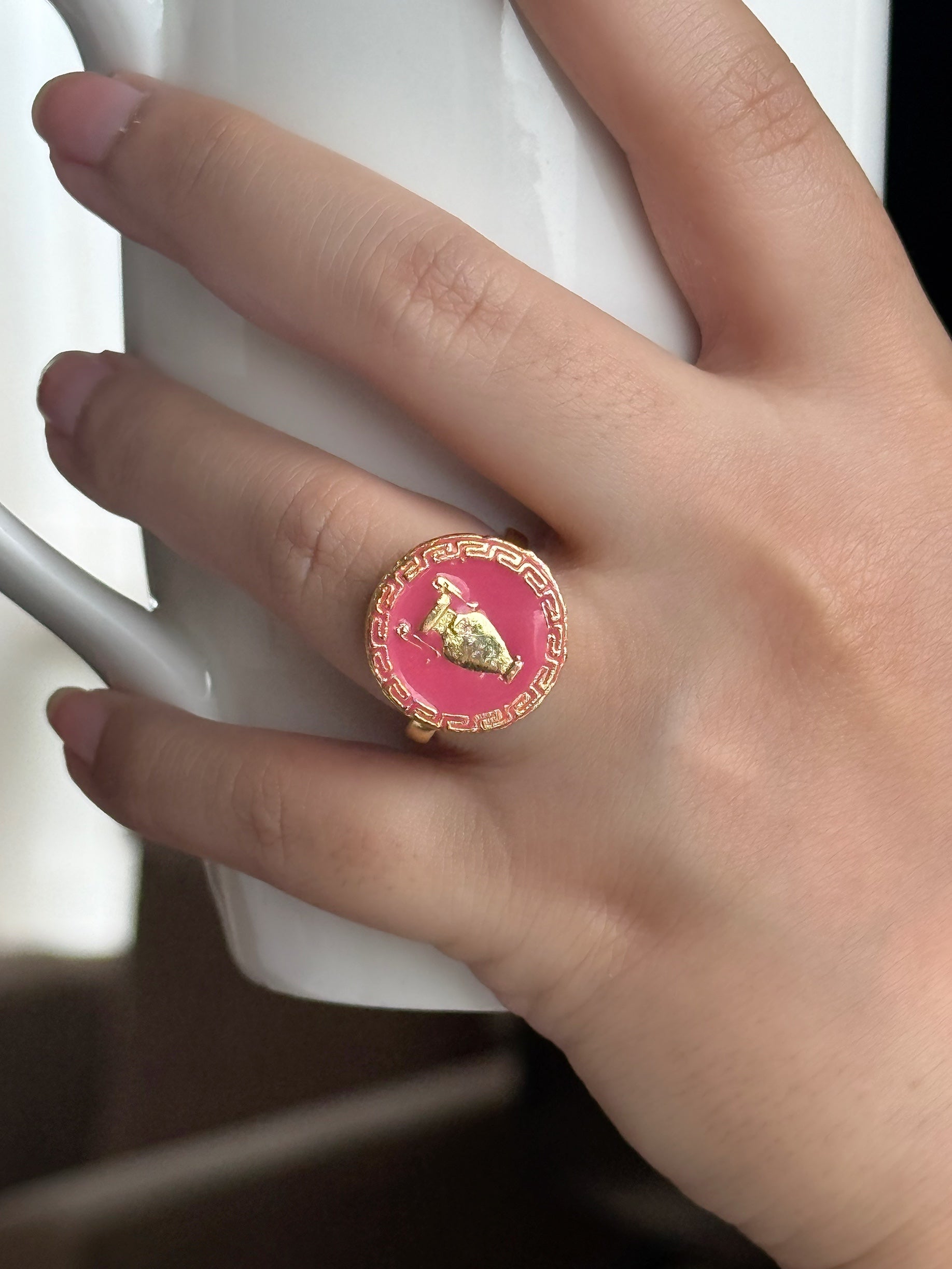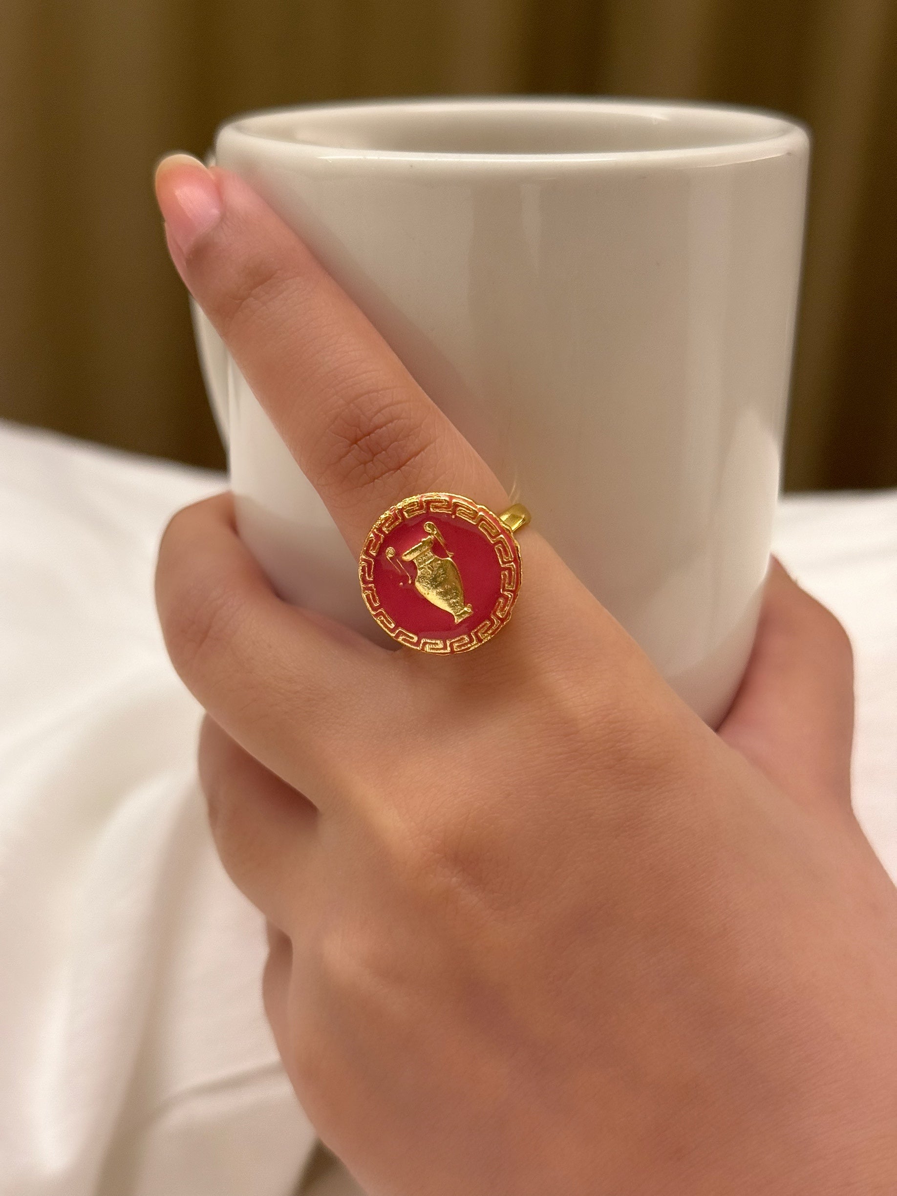 Expertly crafted in rich brass and adorned with glossy enamel, this adjustable ring showcases an intricate urn motif, evoking the charm of classical antiquity.
