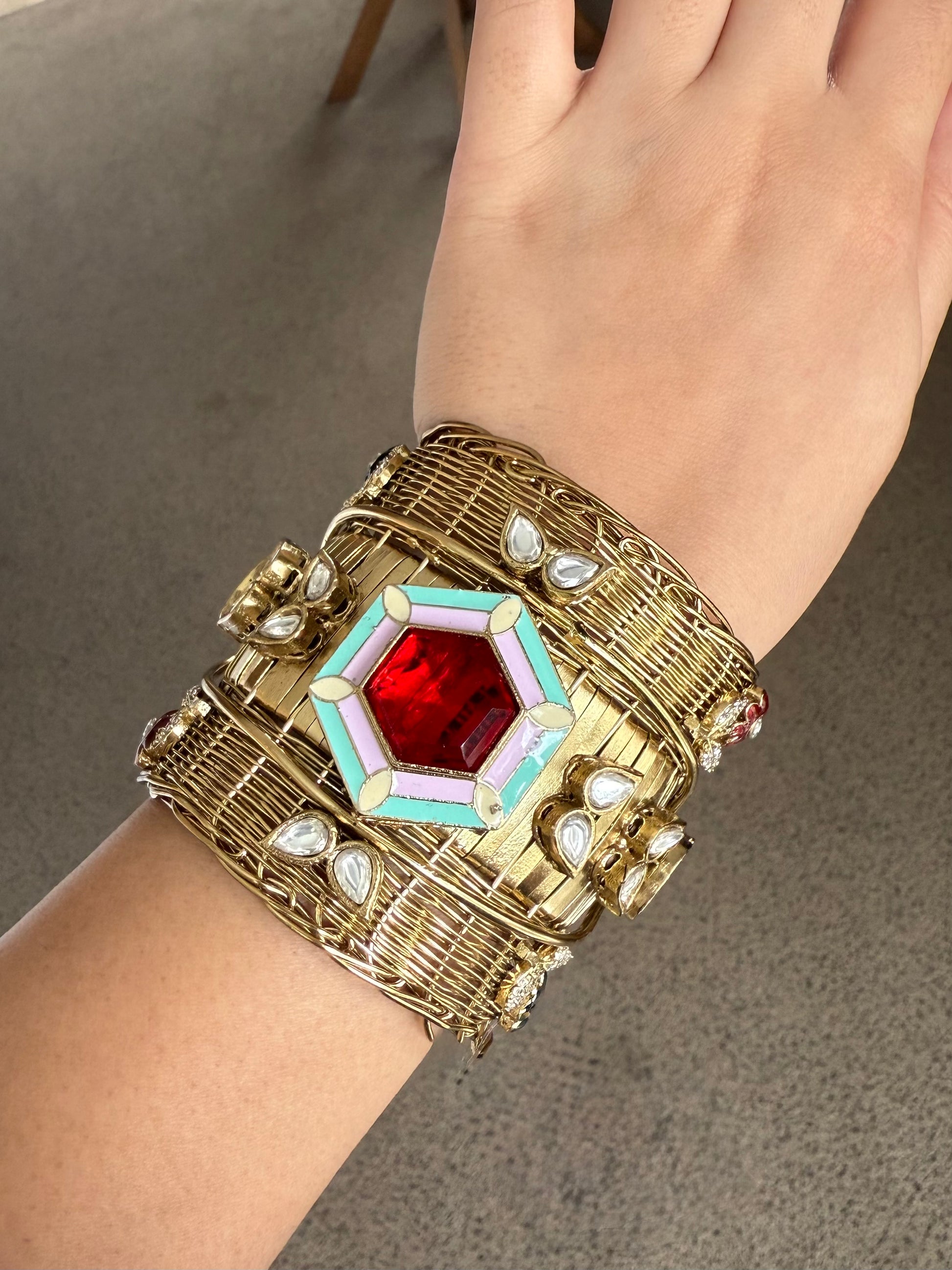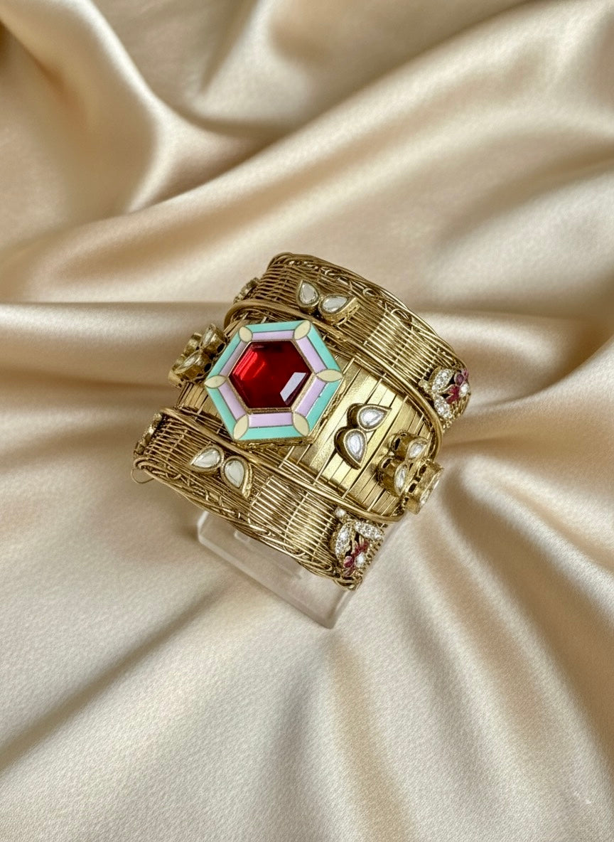 An ode to regal opulence, this statement cuff exudes the grandeur of royal courts. The bold ruby centerpiece, framed with delicate pastel enamel, is accentuated by glistening kundan drops set against intricate gold detailing. This bracelet is size adjustable.