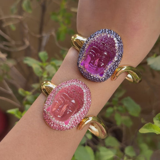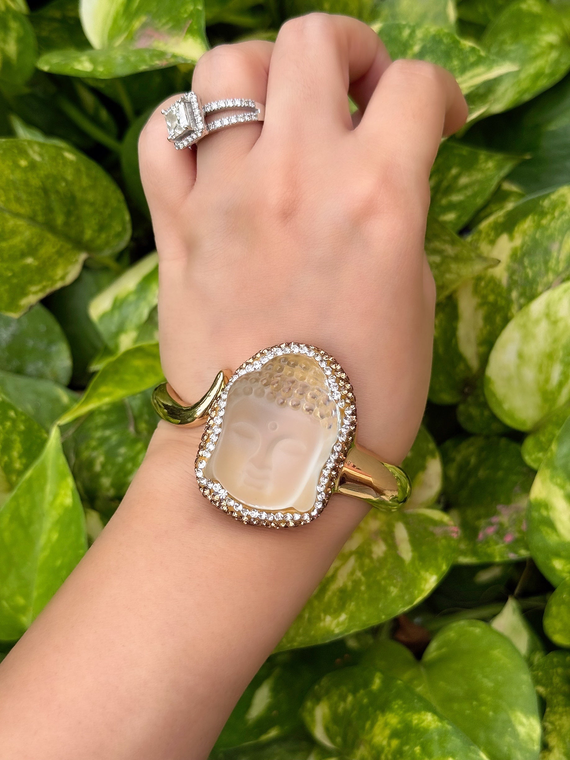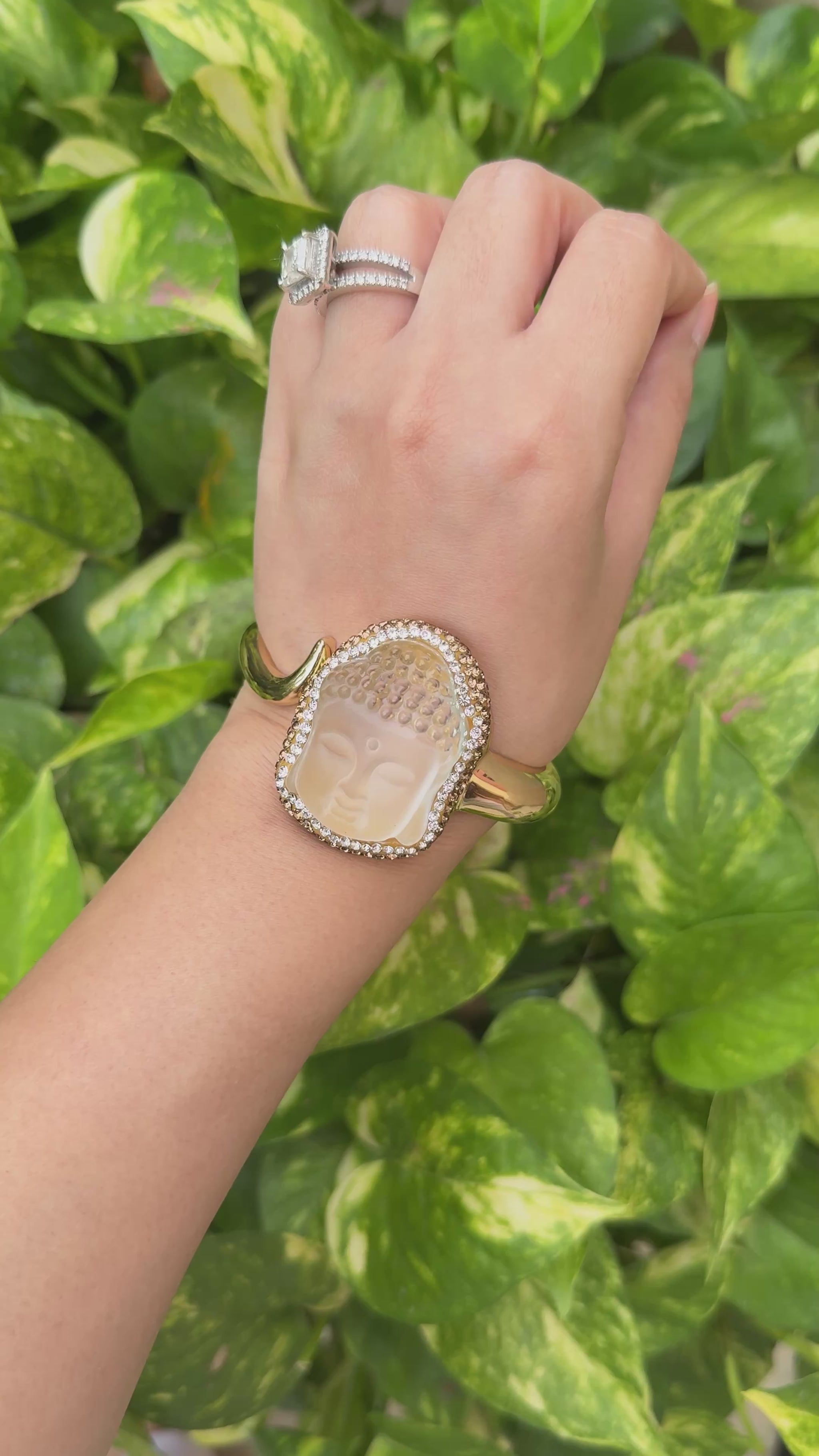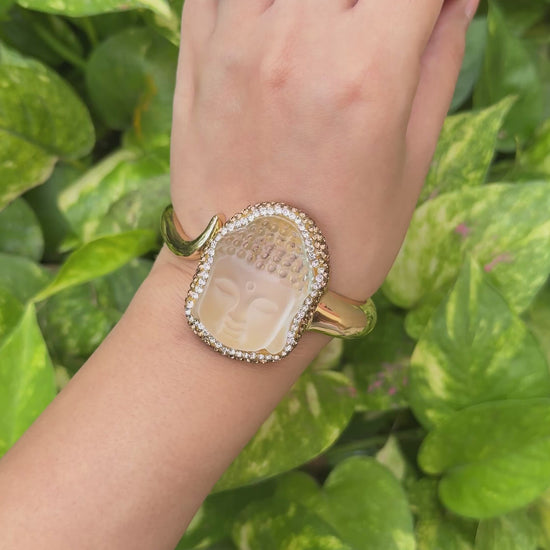 It is high quality stainless steel and is anti tarnish. There is stone setting and the Buddha is made of an iridescent stone crystal..