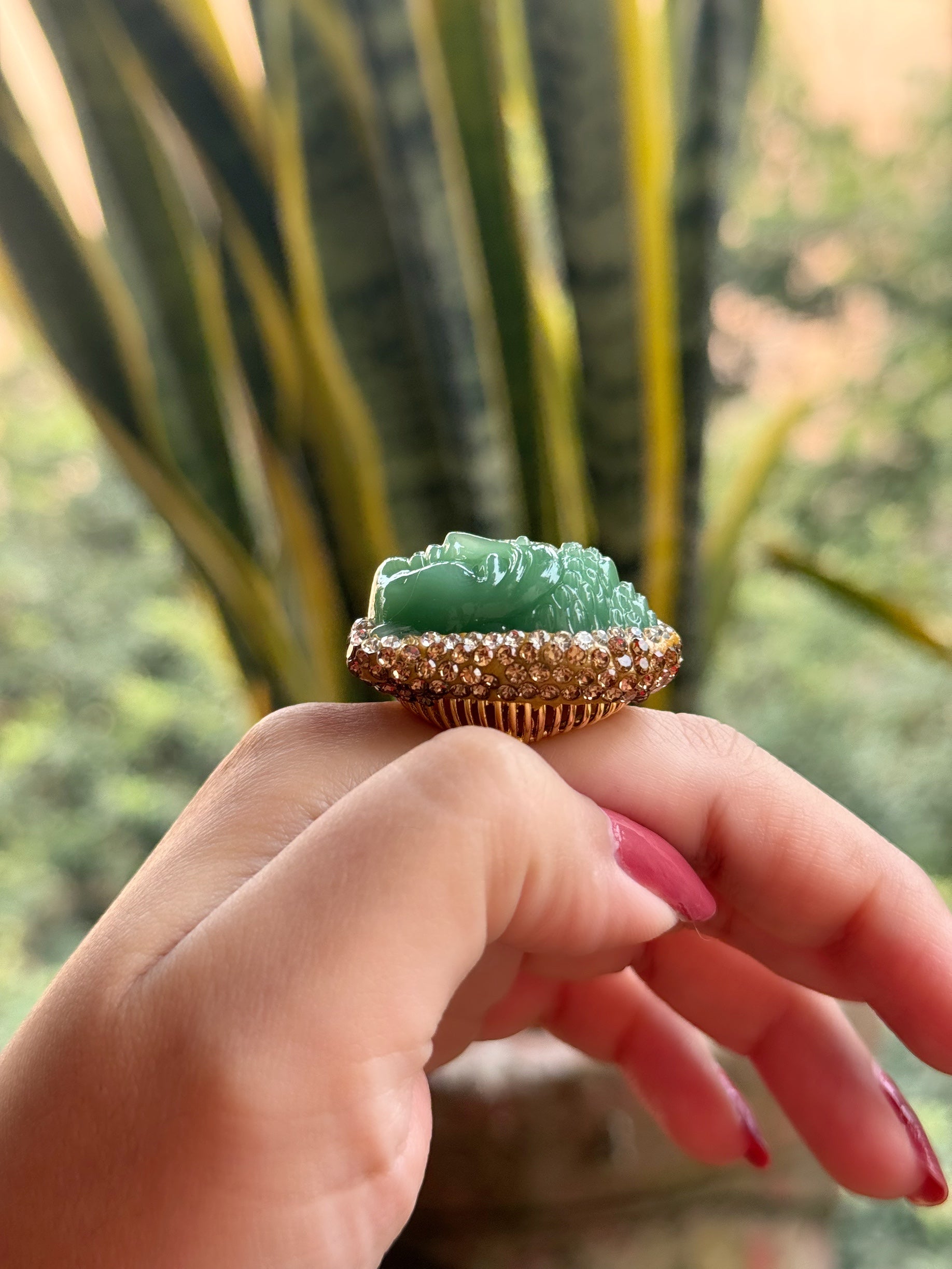 Emanating calm and spiritual grace, Serene is a statement ring that features a meticulously carved Buddha face in beautiful tones. Framed with a delicate halo of shimmering crystals, this piece captures inner peace with dazzling elegance.