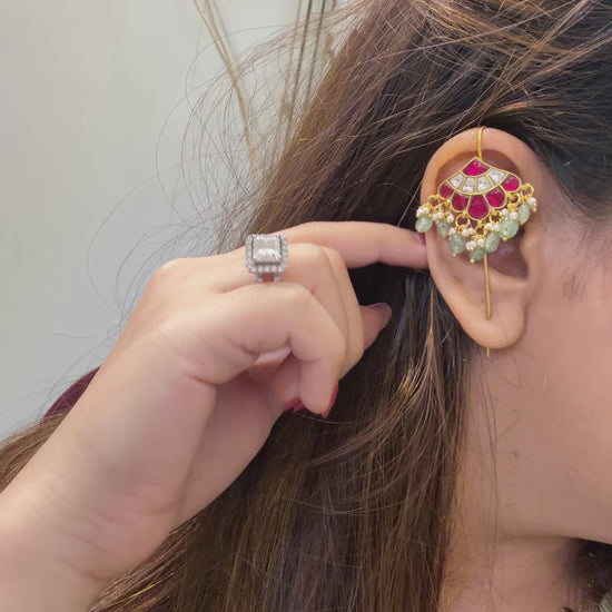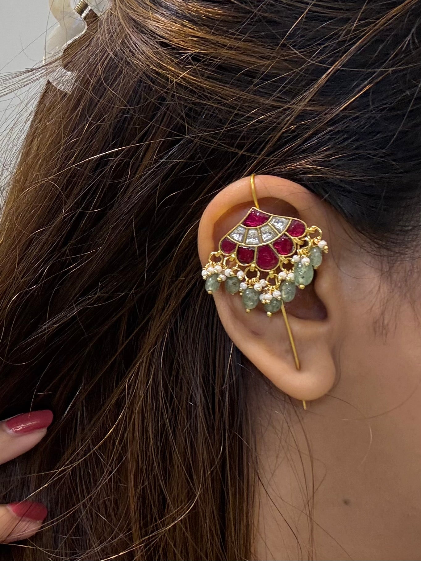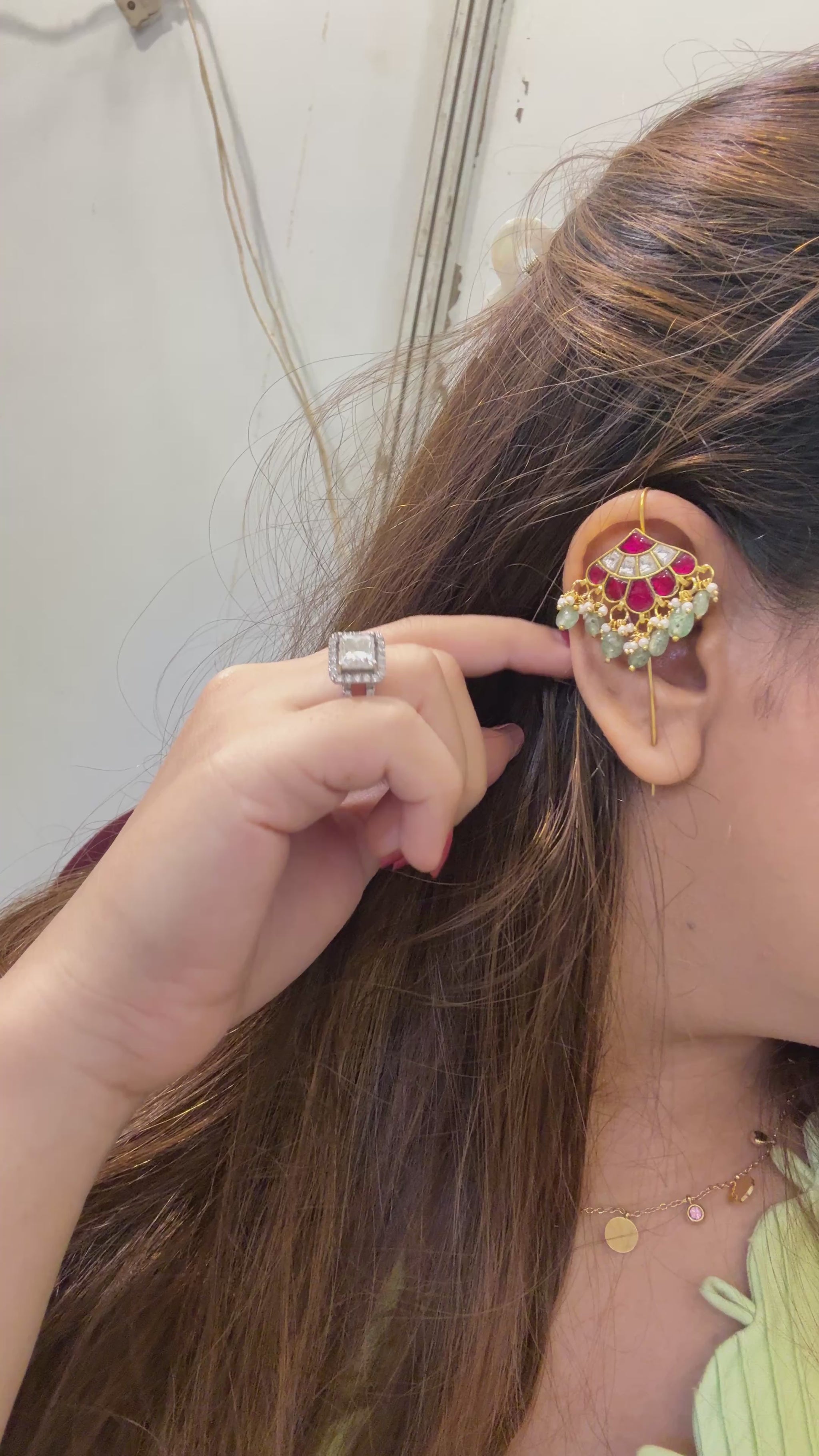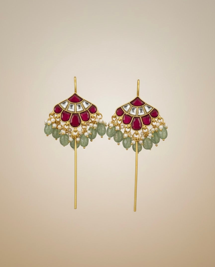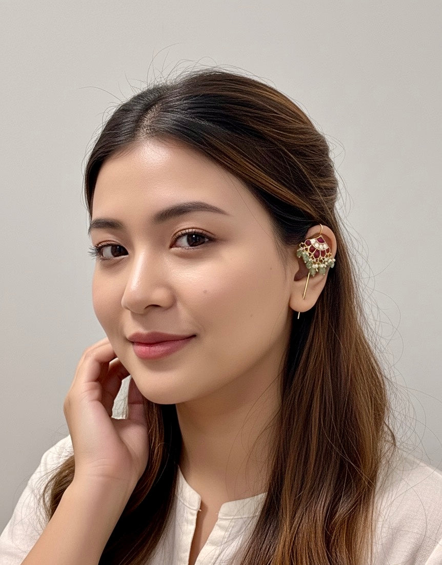 –A graceful bugadi crafted in timeless jadau pachi kundan style. The deep ruby-red petals are crowned with sparkling kundan stars, while delicate strings of pearls and green beads cascade like blossoms kissed by starlight. A perfect blend of royal heritage and festive radiance.