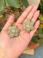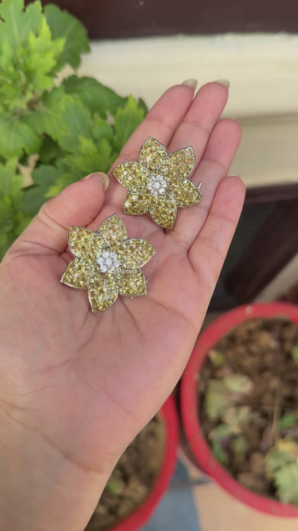 Capture the brilliance of a summer garden with our Sunshine Bloom earrings. These magnificent 6-petal floral studs are meticulously encrusted with canary-yellow pavé stones, creating a seamless mosaic of golden light. At the center, a cluster of brilliant-cut white stones adds a striking, sophisticated contrast.
