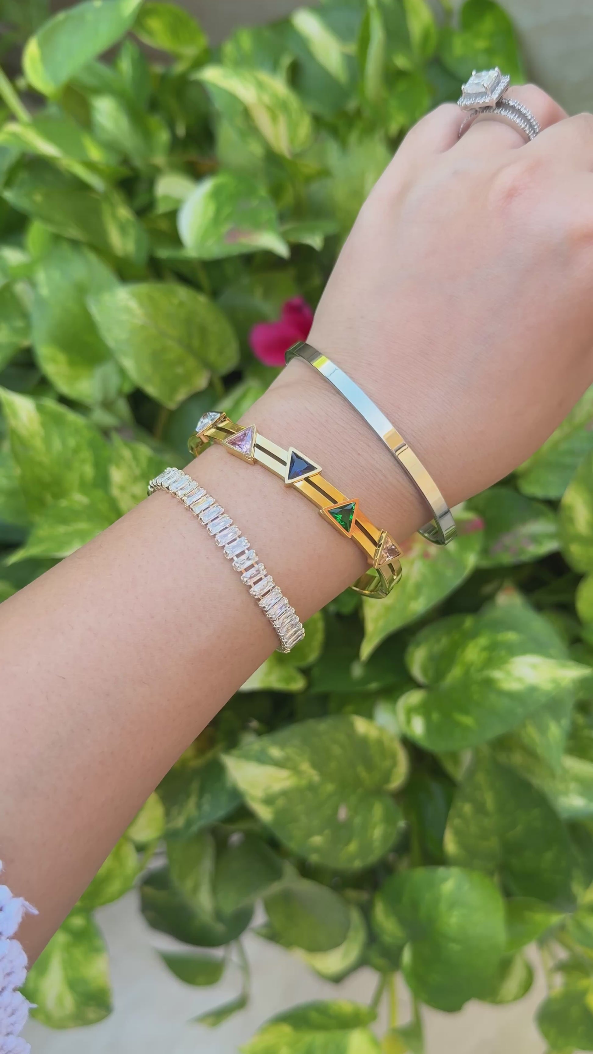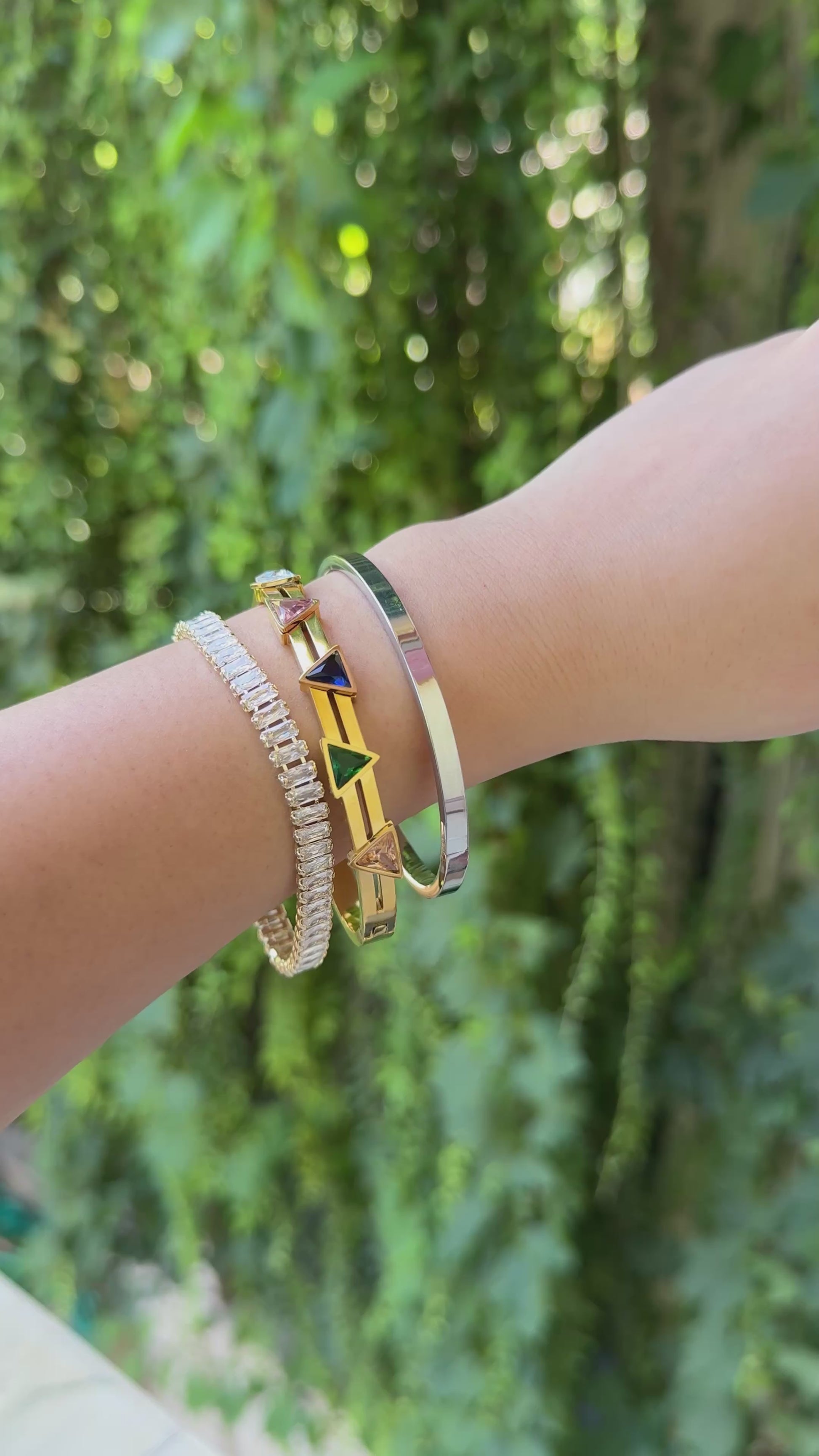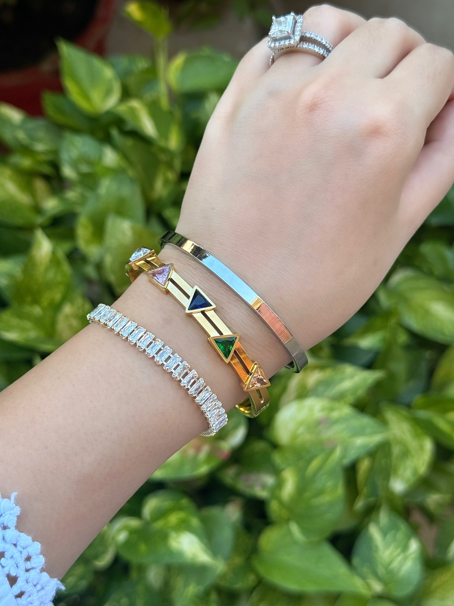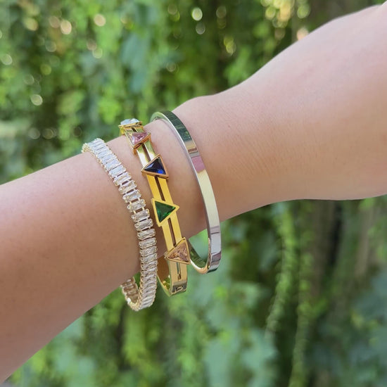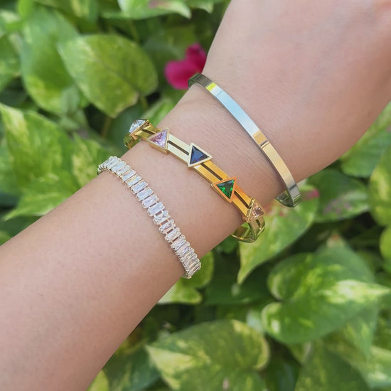 Elevate your everyday with the Luxe Stack—a carefully curated set of three bracelets designed for effortless style. Featuring our dazzling crystal tennis bracelet, a sleek silver bangle, and a chic gold bracelet with colorful geometric crystals, this ready-made stack brings sparkle, color, and modern elegance to your wrist.