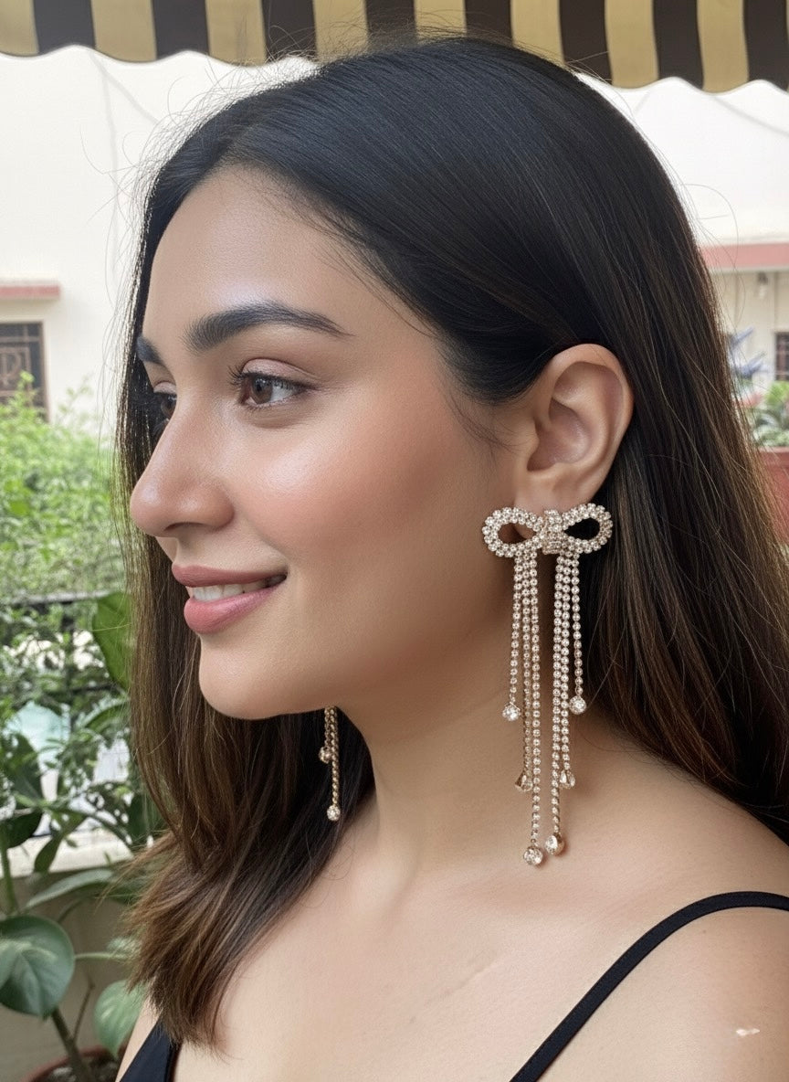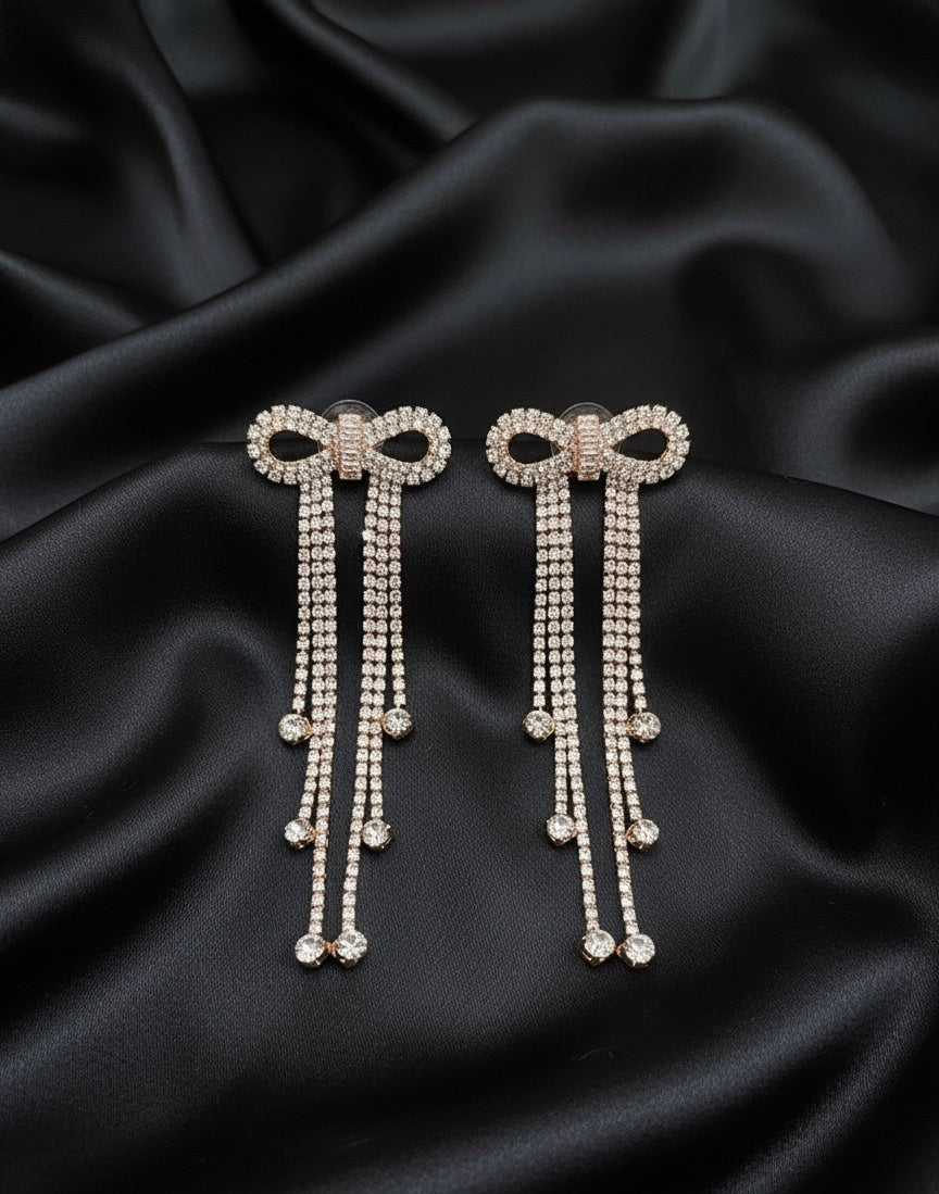 These statement earrings feature a shimmering bow encrusted with rhinestones, from which glistening strands cascade like a soft rainfall of diamonds. Lightweight and graceful, they sway with every movement, adding a touch of glamour to any outfit—whether it’s a cocktail evening or a festive celebration.