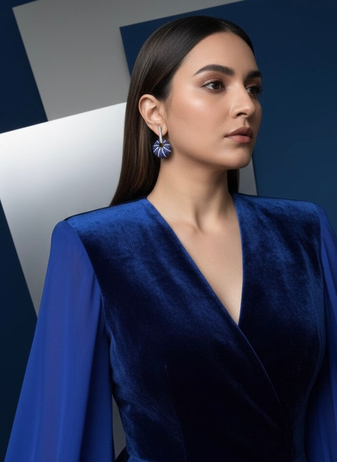 A statement piece in blue and silver, inspired by the night sky. The earrings have a unique, twisted circular design adorned with sparkling dark blue and white stones